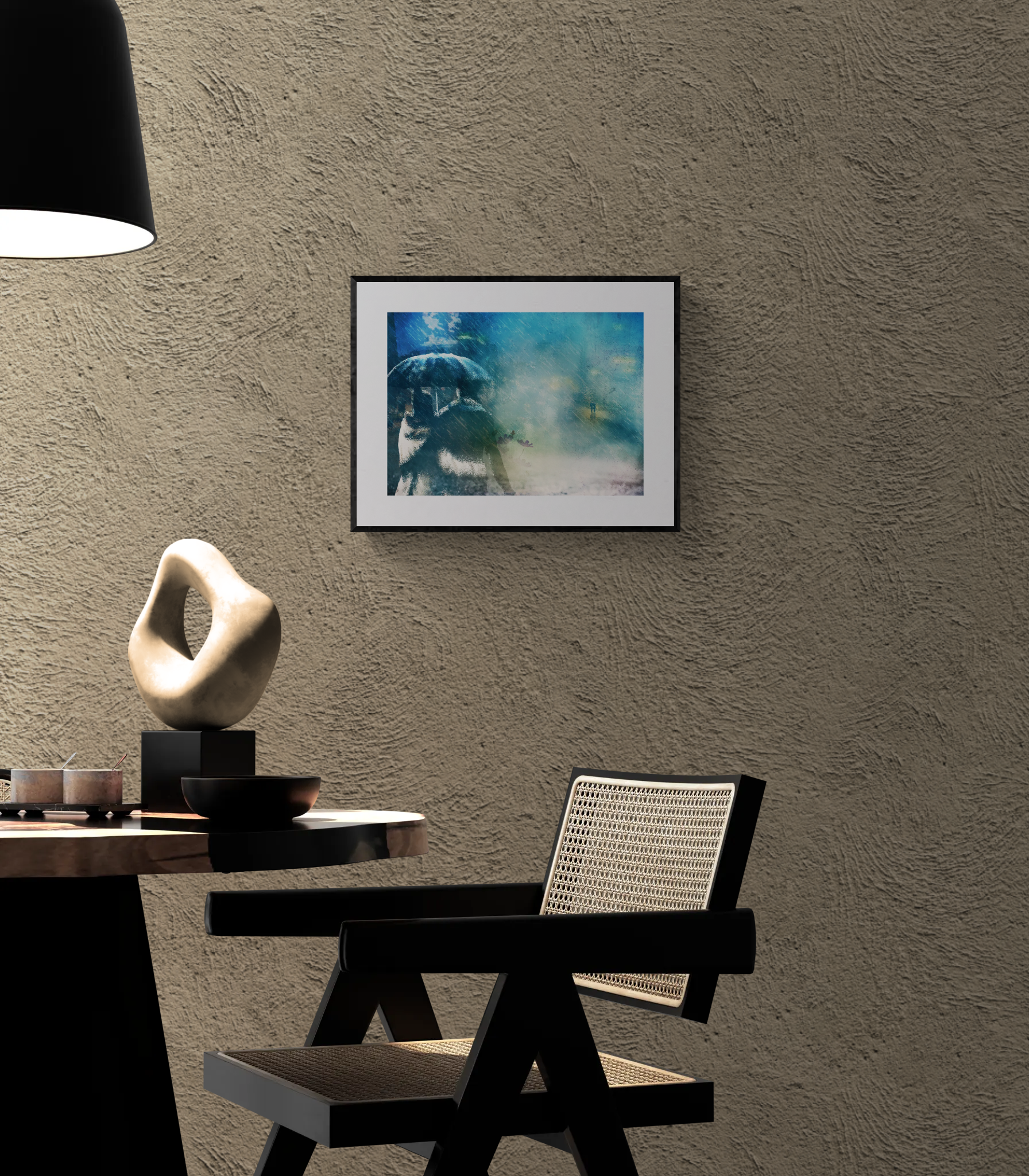 傘を差した想像上のカップルの視線の先には、歩道をどこまでも歩いてゆくカップルが描かれています。これは二人の将来像。